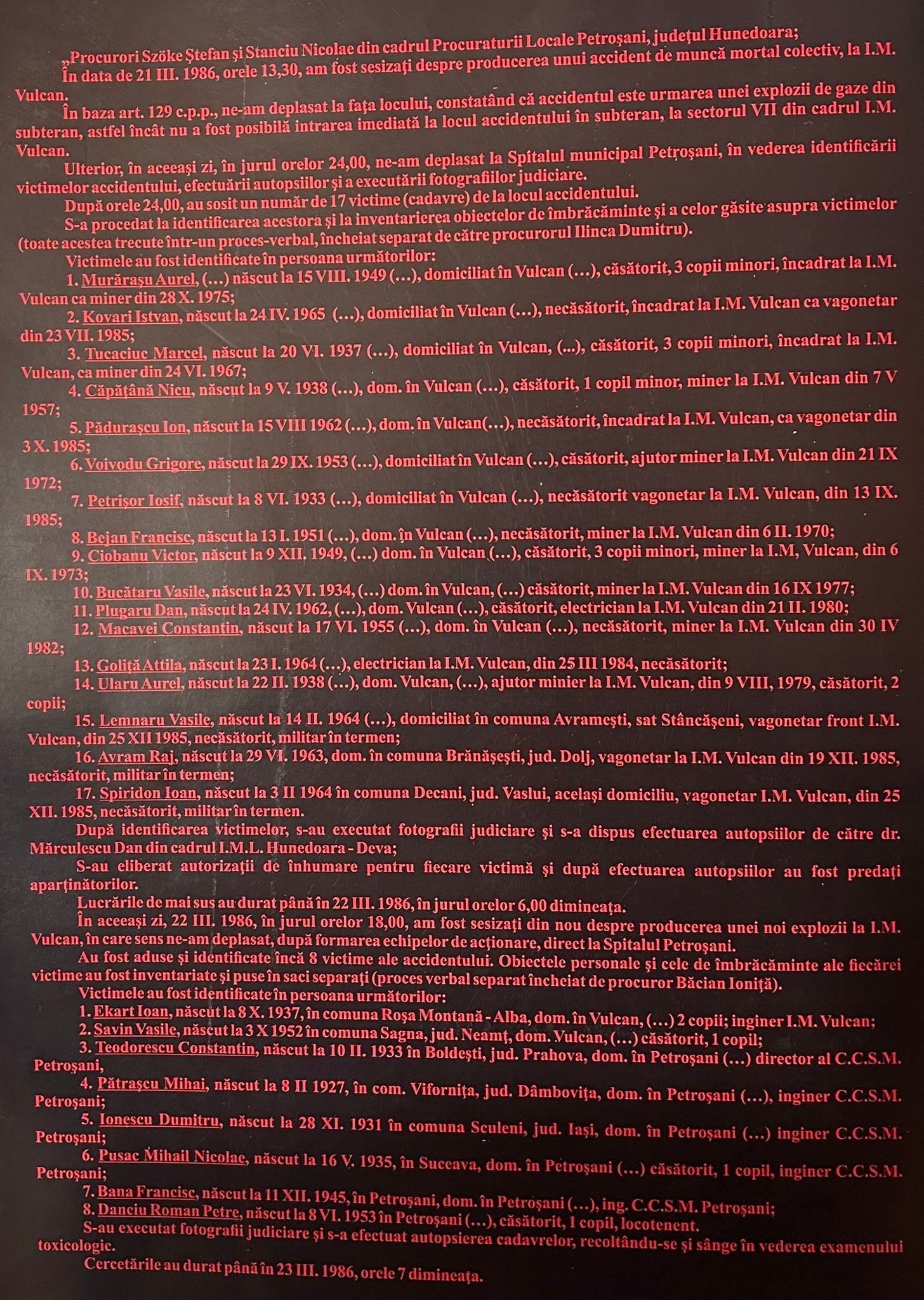 ”În ziua de 22.03.1986, în jurul orei 9, am primit dispoziție de la conducătorul tehnic ing. …. să intru în mină cu o comisie ce se afla în biroul ing. șef securitate minieră. M-am prezentat la comisia care era compusă din tov adjunct al ministrului - Ștefanache Marin, director tehnic - Berceanu Lucian, director CCSM - prof. dr. Teodorescu C-tin, ing. CCSM Pătrașcu Mihai - șef laborator CCSM Petroșani, ing. Ionescu Dumitru - cercetător principal CCSM, ing. Pusak Mihai Nicolae - cercetător principal la CCSM, ing. Barna Francisc de la CCSM, ing. Avramescu Traian - inspector șef adjunct ISTPM Hunedoara, Tat Sabin - cercetător principal la CCSM. Tot în biroul ing. șef securitate minieră au fost și ofițerii de la MAI, precum și tov. căpitan Cherciu V. Împreună cu comisia am plecat la baie de unde, după ce ne-am echipat, ne-am deplasat cu toții în subteran.